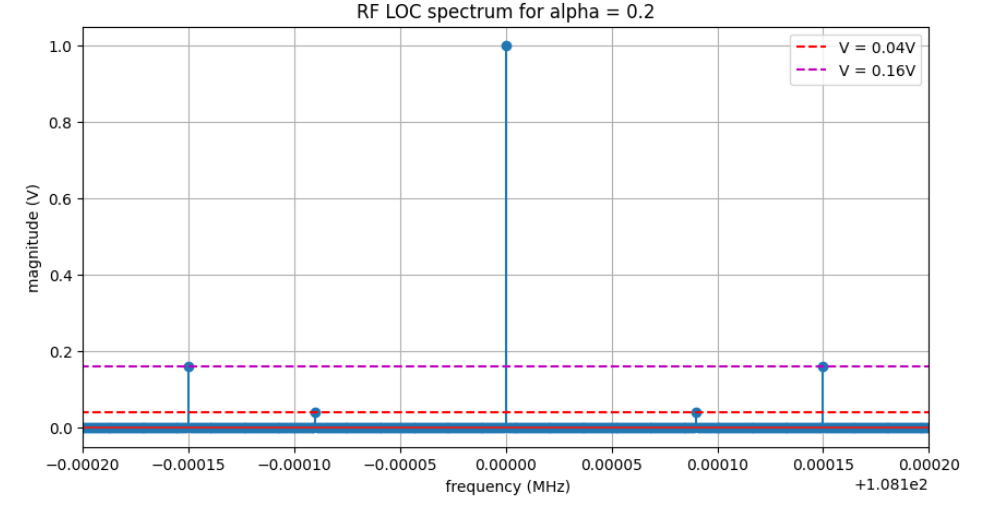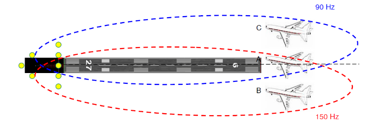 Les fréquences et les amplitudes des deux porteuses sont identiques et chacune est modulée à 40 % par le signal modulant. Le spectre rayonné par chaque antenne présente donc un pic central qui est la porteuse et deux petites bandes latérales correspondant aux enveloppes des deux modulations. Dans notre cas cela correspond à des raies. Comme l’avion est dans l’axe de la piste, l’amplitude des raies “90Hz” et “150Hz” est identique.
